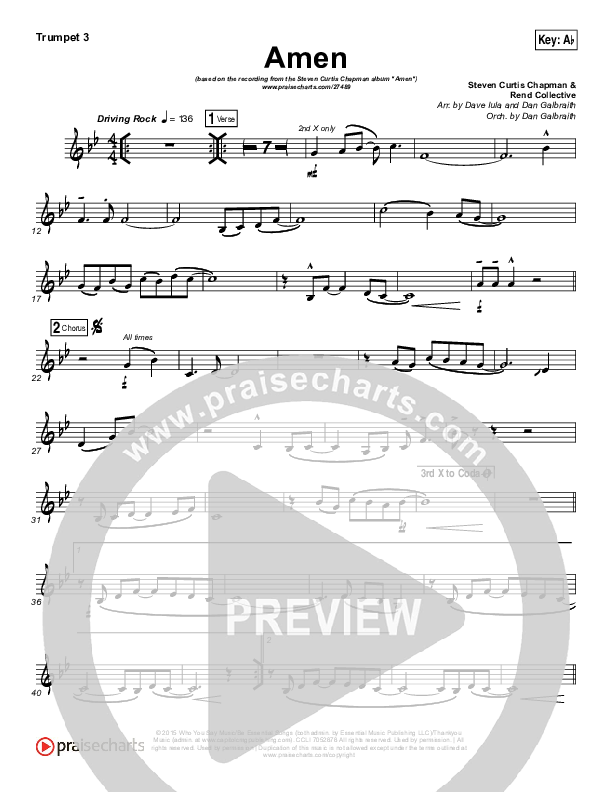 Download the Trumpet 3 sheet music for Amen by Steven Curtis Chapman, from the album Worship And Believe. This song was arranged by Dave Iula / Daniel Galbraith in the key of Ab, G.