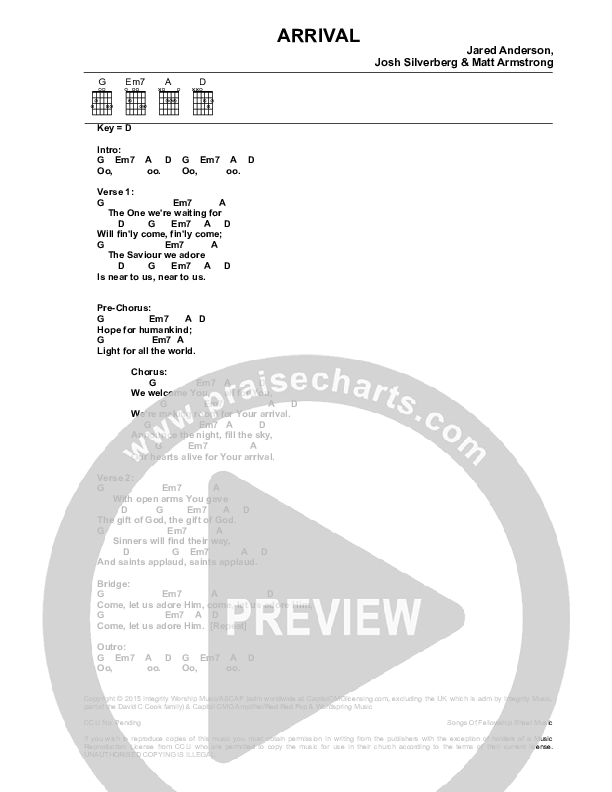 Download the PDF Chord Charts for Arrival by Jared Anderson, from the album Arrival. This song was arranged by Centricity Worship in the key of D.