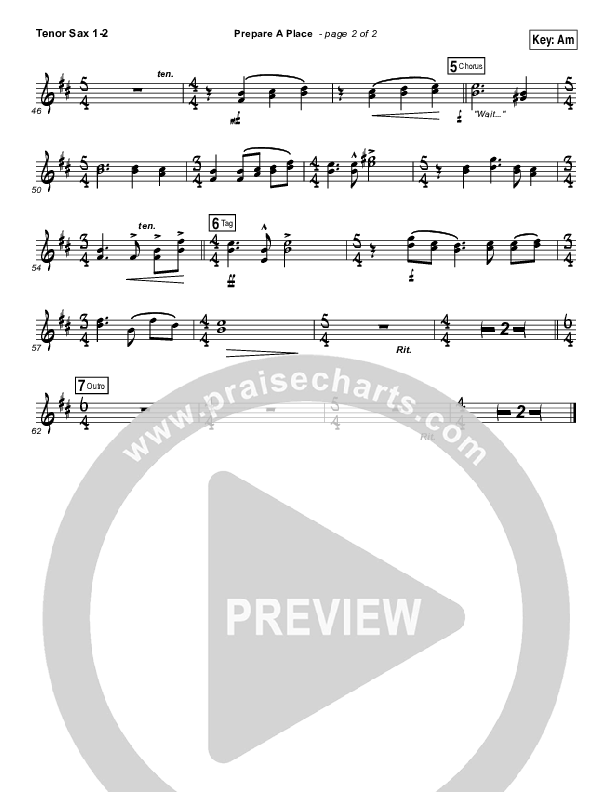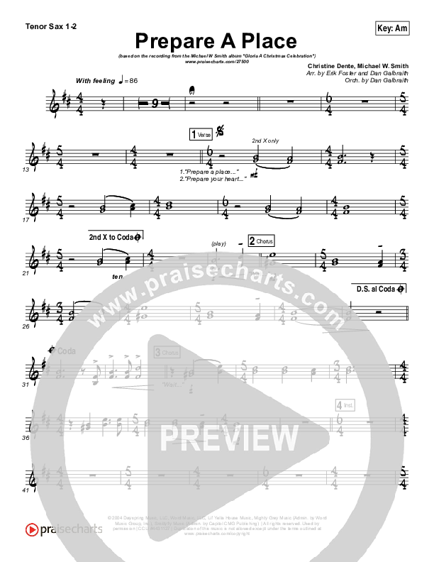 Download the Tenor Sax sheet music for Prepare A Place by Michael W. Smith / Christine Dente, from the album Gloria: A Christmas Celebration. This song was arranged by Erik Foster / Daniel Galbraith in the key of Am, Bm.