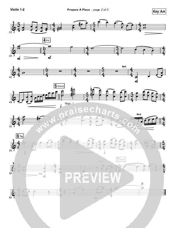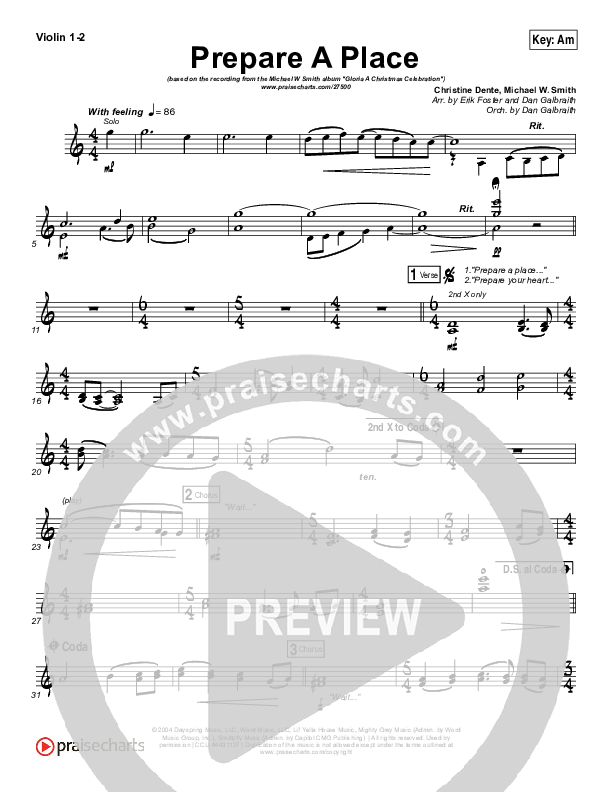 Download the Violin sheet music for Prepare A Place by Michael W. Smith / Christine Dente, from the album Gloria: A Christmas Celebration. This song was arranged by Erik Foster / Daniel Galbraith in the key of Am, Bm.