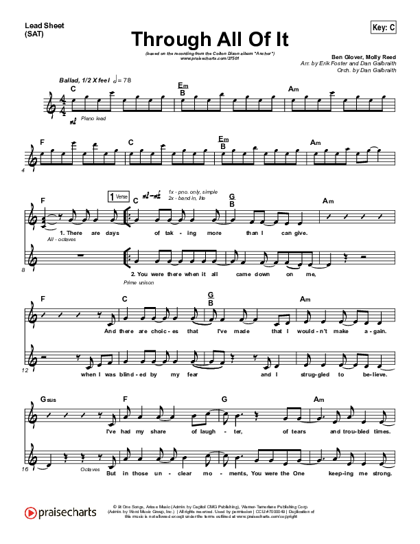 Download the sheet music for Through All Of It by Colton Dixon, from the album Anchor. This song was arranged by Erik Foster / Daniel Galbraith in the key of Bb, C.