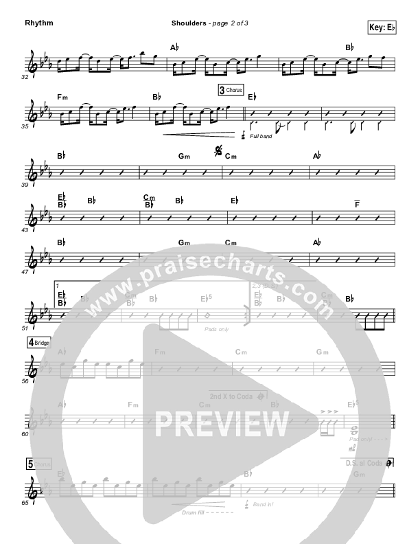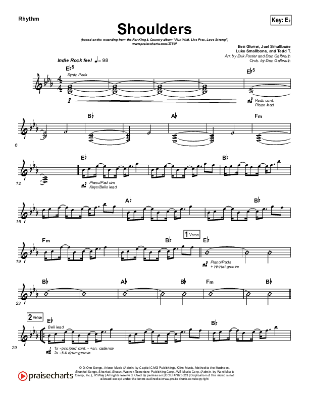 Download the Rhythm Chart for Shoulders by for KING & COUNTRY, from the album Run Wild Live Free. This song was arranged by Erik Foster / Daniel Galbraith in the key of D, Eb.