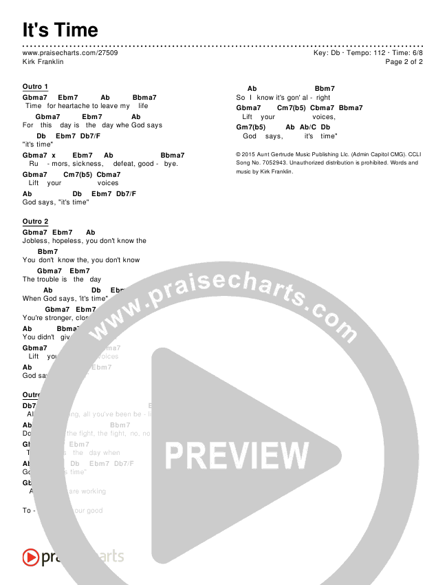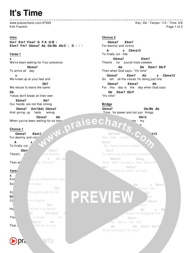 Download the PDF Chord Charts for It's Time by Kirk Franklin, from the album Losing My Religion. This song was arranged by Jared Haschek in the key of C, Db.