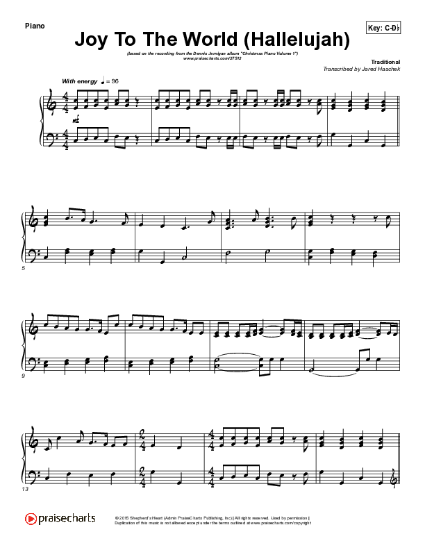 Download the sheet music for Joy To The World (Hallelujah) by Dennis Jernigan, from the album Christmas Piano Volume 1. This song was arranged by Jared Haschek in the key of C.