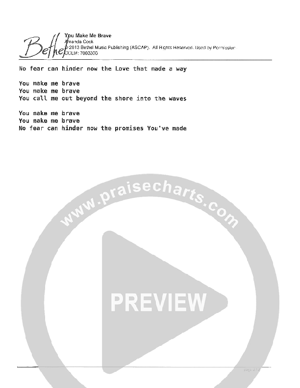 Download the PDF Chord Charts for You Make Me Brave by Bethel Kids, from the album Come Alive. This song was arranged by Bethel Music in the key of .