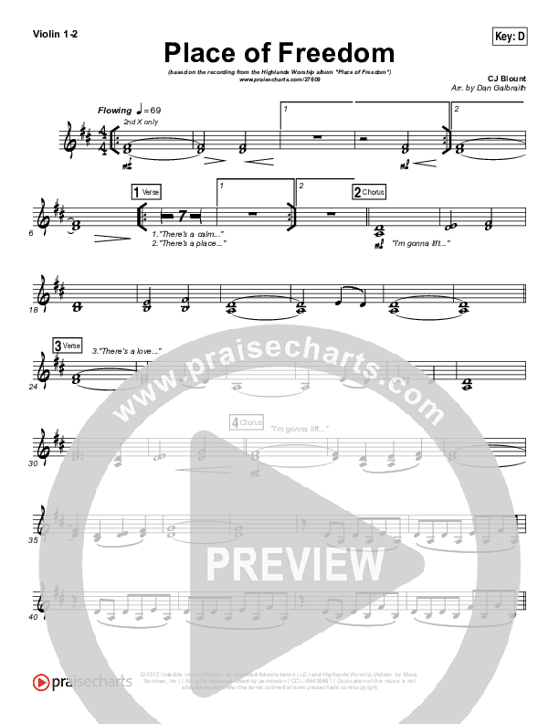 Download the Violin sheet music for Place Of Freedom by Highlands Worship, from the album Place Of Freedom. This song was arranged by Daniel Galbraith in the key of D, E, Eb, F.