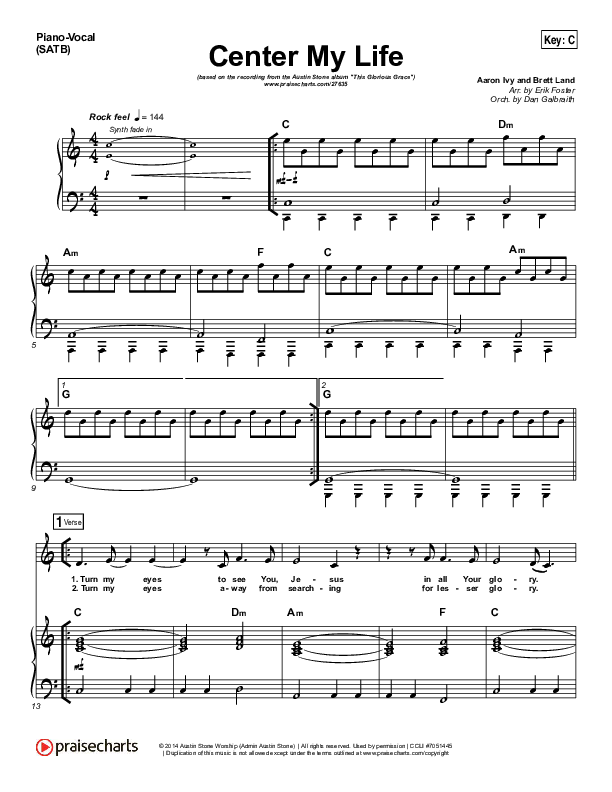 Download the sheet music for Center My Life by Austin Stone Worship, from the album This Glorious Grace. This song was arranged by Erik Foster / Daniel Galbraith in the key of A, C, D.