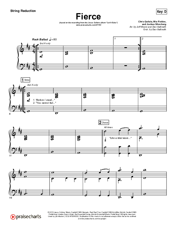 Download the Orchestration string parts for Fierce (Studio) by Jesus Culture / Chris Quilala, from the album Let It Echo. This song was arranged by Jeff Moore / Daniel Galbraith in the key of B, Bb, C, D.