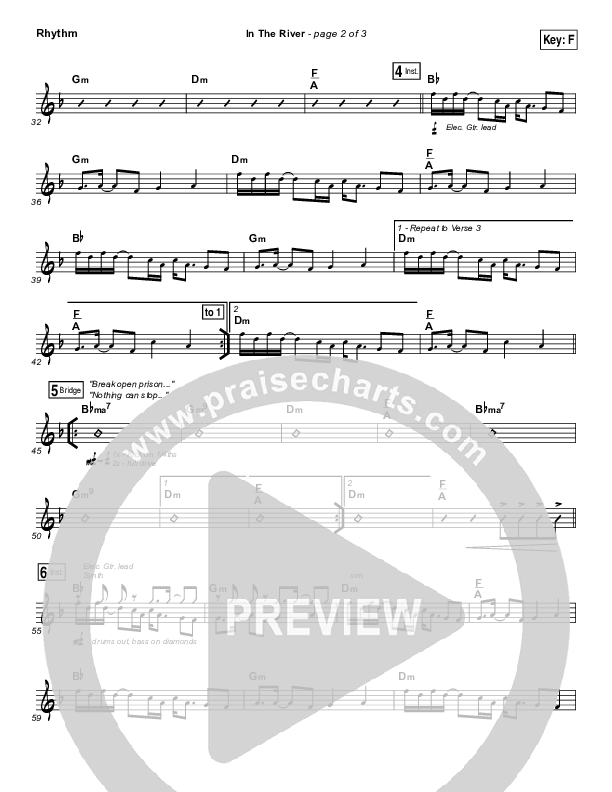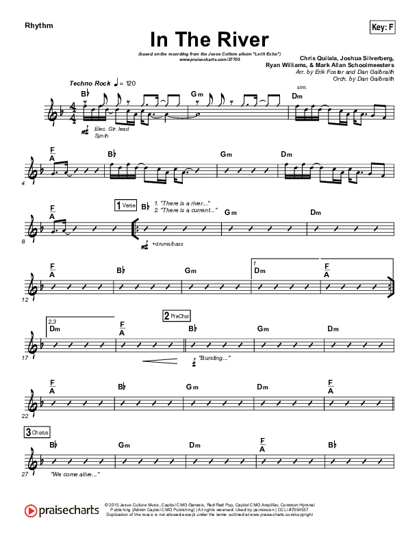 Download the Rhythm Chart for In The River by Jesus Culture / Kim Walker-Smith, from the album Let It Echo. This song was arranged by Erik Foster / Daniel Galbraith in the key of E, Eb, F, G.