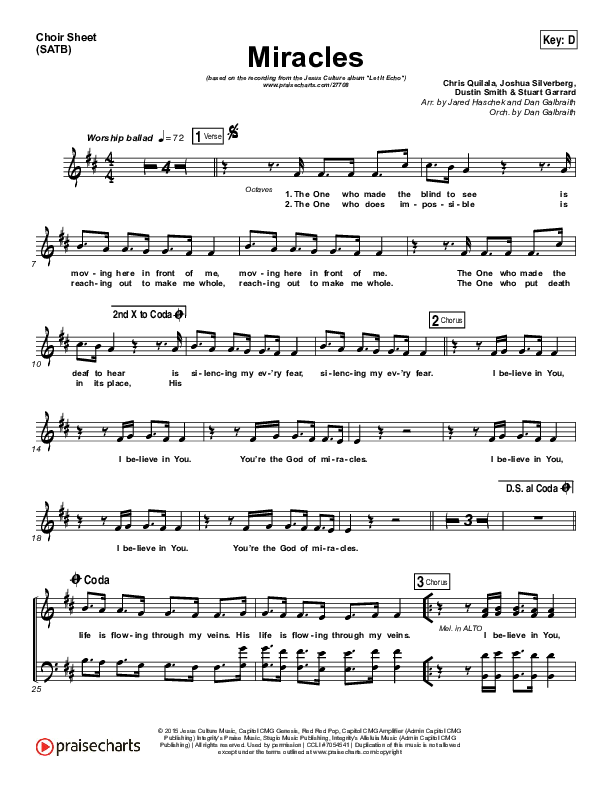 Download the Choir Sheet for Miracles by Jesus Culture / Chris Quilala, from the album Let It Echo. This song was arranged by Jared Haschek / Daniel Galbraith in the key of A, B, Bb, C, D.