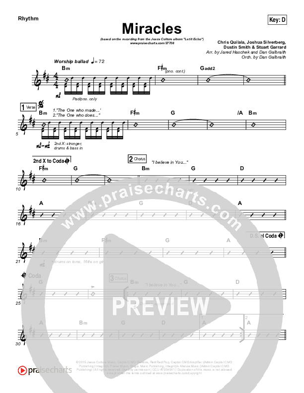 Download the Rhythm Chart for Miracles by Jesus Culture / Chris Quilala, from the album Let It Echo. This song was arranged by Jared Haschek / Daniel Galbraith in the key of A, B, Bb, C, D.