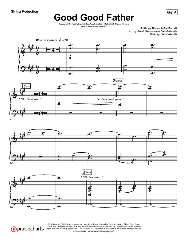 Download the Orchestration for Good Good Father by Kristian Stanfill / Passion, from the album Salvation's Tide Is Rising. This song was arranged by Jared Haschek / Daniel Galbraith in the key of A, Ab, G.