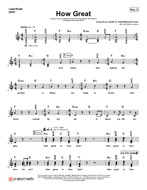 Download the sheet music for How Great by Corey Voss, from the album How Great. This song was arranged by Dustin Loehrs in the key of Bb, C.