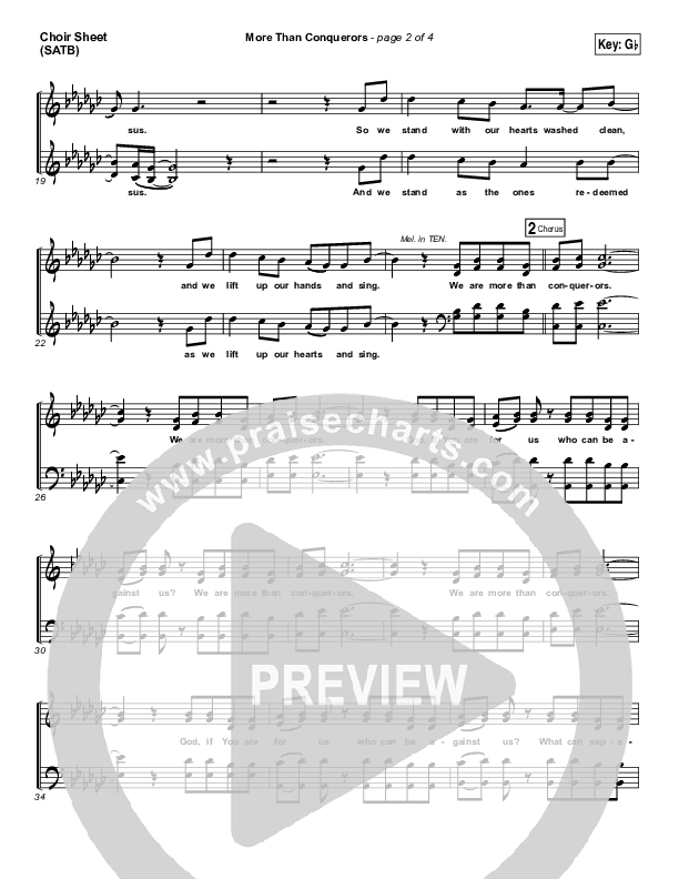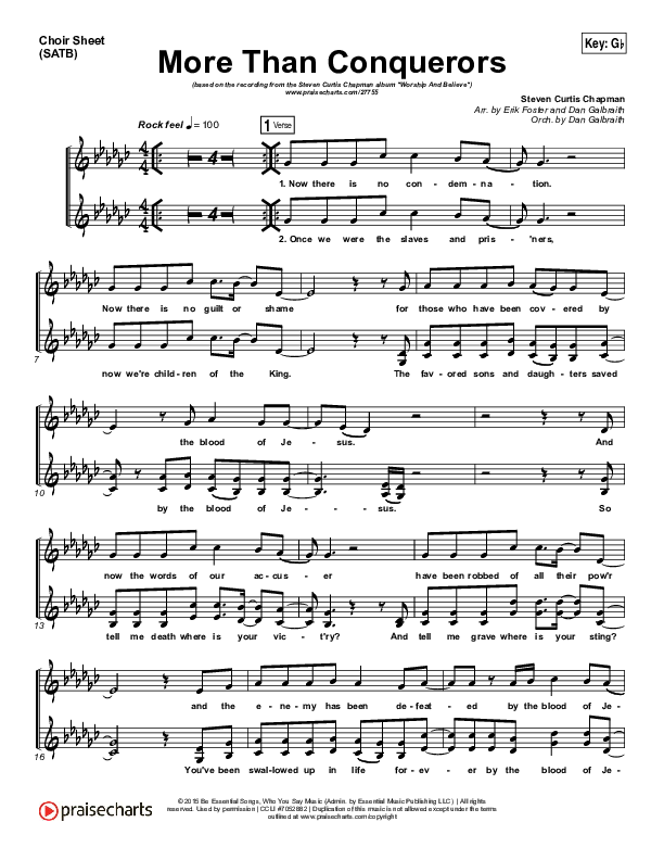 Download the Choir Sheet for More Than Conquerors by Steven Curtis Chapman, from the album Worship And Believe. This song was arranged by Erik Foster / Daniel Galbraith in the key of G, Gb.