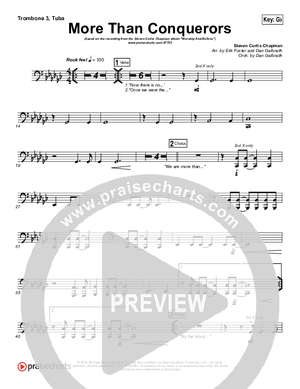 Download the Trombone 3/Tuba sheet music for More Than Conquerors by Steven Curtis Chapman, from the album Worship And Believe. This song was arranged by Erik Foster / Daniel Galbraith in the key of G, Gb.