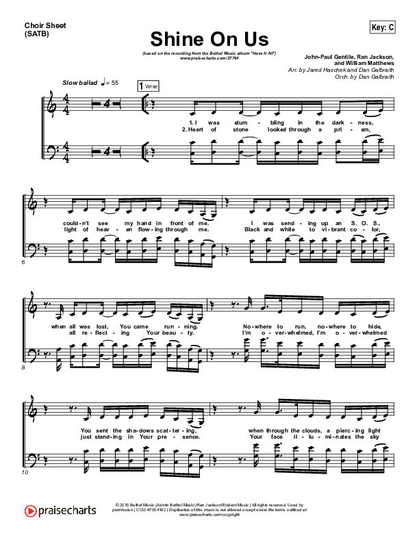 Download the Choir Sheet for Shine On Us by Bethel Music / William Matthews, from the album Have It All. This song was arranged by Jared Haschek / Daniel Galbraith in the key of A, Bb, C, G.
