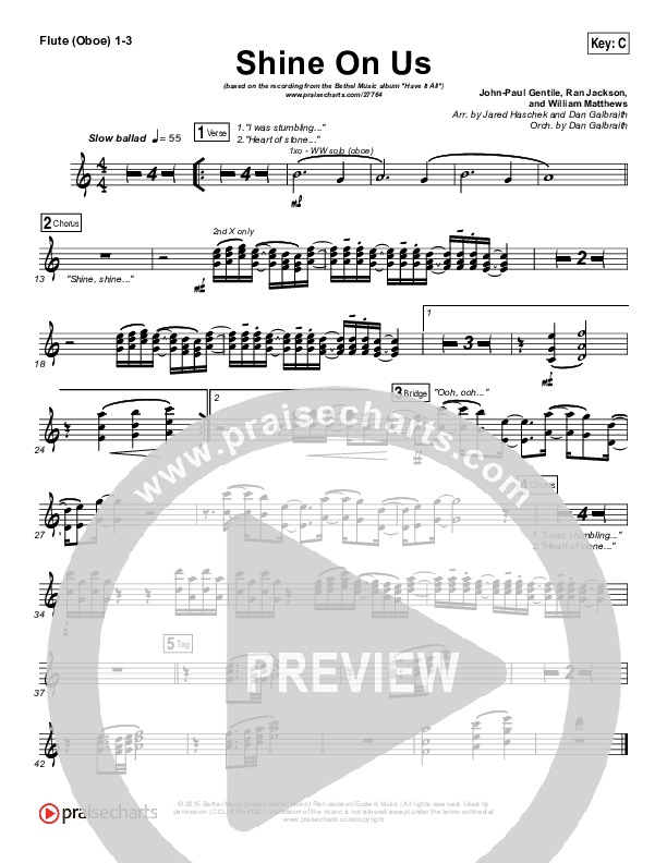 Download the Flute/Oboe sheet music for Shine On Us by Bethel Music / William Matthews, from the album Have It All. This song was arranged by Jared Haschek / Daniel Galbraith in the key of A, Bb, C, G.