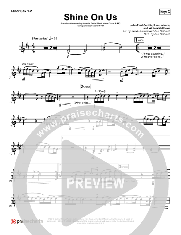 Download the Tenor Sax sheet music for Shine On Us by Bethel Music / William Matthews, from the album Have It All. This song was arranged by Jared Haschek / Daniel Galbraith in the key of A, Bb, C, G.
