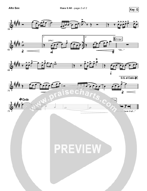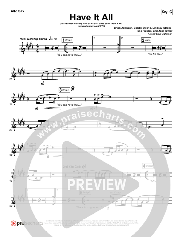 Download the AltoSax sheet music for Have It All by Bethel Music / Brian Johnson, from the album Have It All. This song was arranged by Daniel Galbraith in the key of Ab, G.