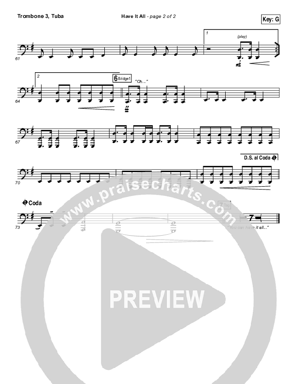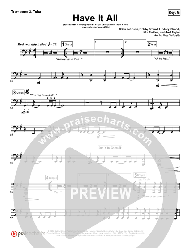 Download the Trombone 3/Tuba sheet music for Have It All by Bethel Music / Brian Johnson, from the album Have It All. This song was arranged by Daniel Galbraith in the key of Ab, G.