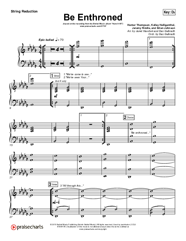 Download the Orchestration string parts for Be Enthroned by Bethel Music / Jeremy Riddle, from the album Have It All. This song was arranged by Jared Haschek / Daniel Galbraith in the key of C, Db.