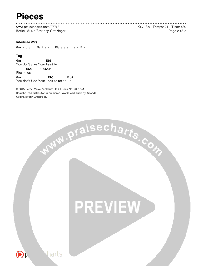 Download the PDF Chord Charts for Pieces by Bethel Music / Steffany Gretzinger, from the album Have It All. This song was arranged by Jared Haschek / Daniel Galbraith in the key of Bb, C.