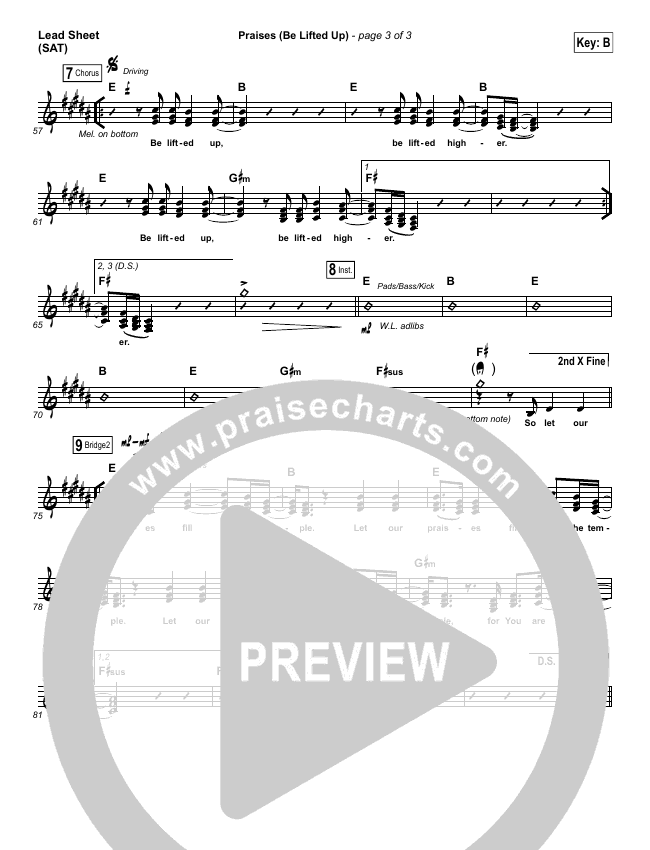 Download the sheet music for Praises (Be Lifted Up) by Bethel Music / Josh Baldwin, from the album Have It All. This song was arranged by Erik Foster / Daniel Galbraith in the key of B, Bb.