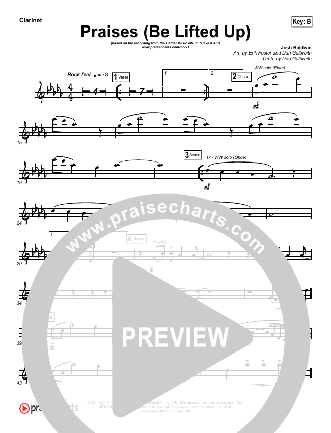 Download the Orchestration wind parts for Praises (Be Lifted Up) by Bethel Music / Josh Baldwin, from the album Have It All. This song was arranged by Erik Foster / Daniel Galbraith in the key of B, Bb.