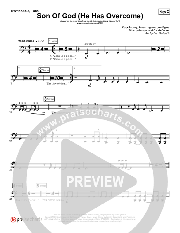 Download the Trombone 3/Tuba sheet music for Son Of God (He Has Overcome) by Bethel Music / Cory Asbury, from the album Have It All. This song was arranged by Daniel Galbraith in the key of B, Bb, C, D.