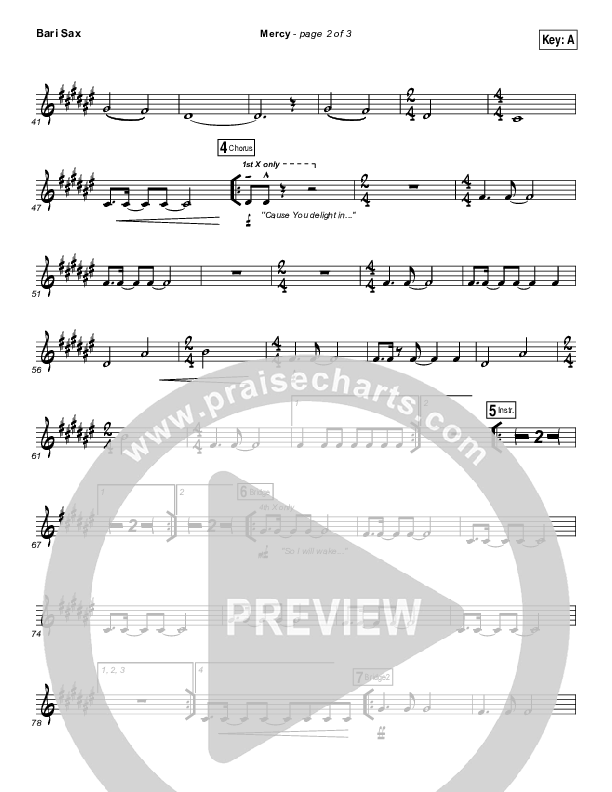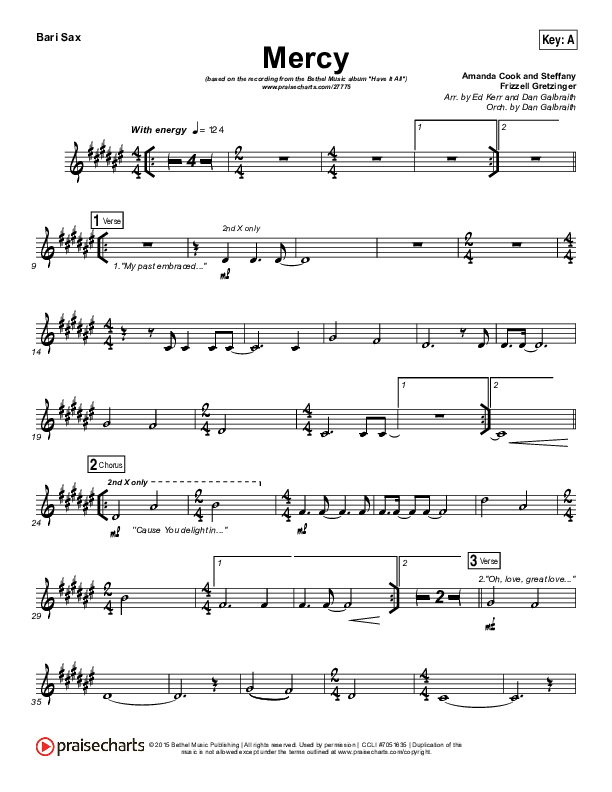 Download the Bari Sax sheet music for Mercy by Bethel Music / Amanda Lindsey Cook, from the album Have It All. This song was arranged by Ed Kerr / Daniel Galbraith in the key of A, Gb.