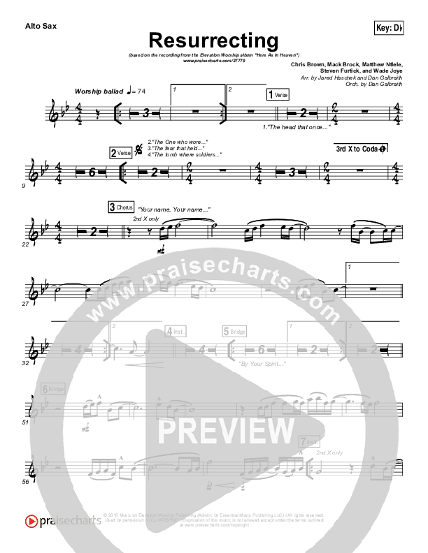 Download the AltoSax sheet music for Resurrecting (Live) by Elevation Worship, from the album Here As In Heaven. This song was arranged by Jared Haschek / Daniel Galbraith in the key of A, B, Bb, C, D, Db.