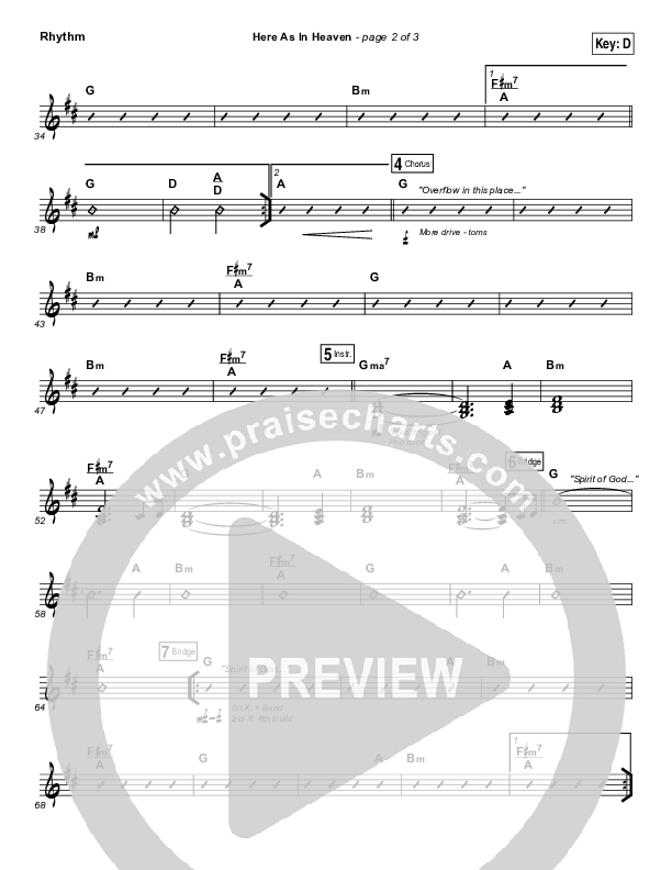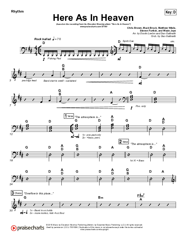 Download the Rhythm Chart for Here As In Heaven by Elevation Worship, from the album Here As In Heaven. This song was arranged by Dustin Loehrs / Daniel Galbraith in the key of B, Bb, C, D, Eb, F.