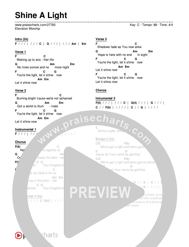 Download the PDF Chord Charts for Shine A Light by Elevation Worship, from the album Here As In Heaven. This song was arranged by Dave Iula / Daniel Galbraith in the key of Bb, C.