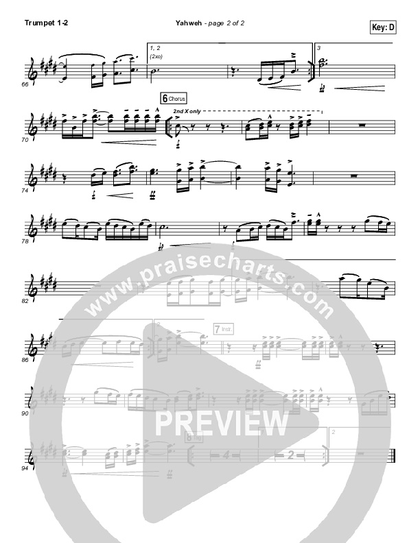 Download the trumpet sheet music for Yahweh by Elevation Worship, from the album Here As In Heaven. This song was arranged by Dustin Loehrs / Daniel Galbraith in the key of C, D.