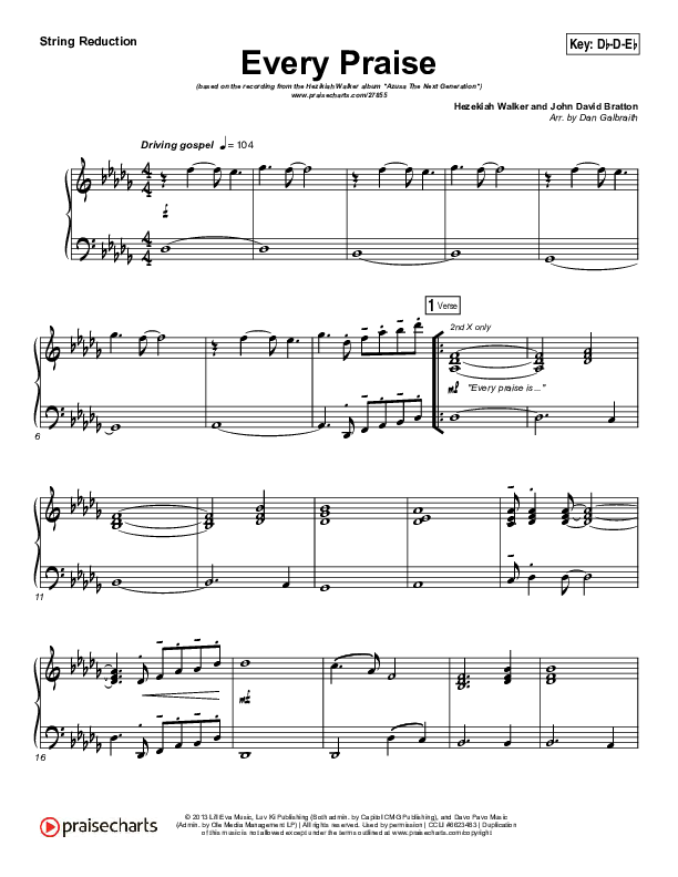 Download the Orchestration for Every Praise by Hezekiah Walker, from the album Azusa The Next Generation. This song was arranged by Daniel Galbraith in the key of B, Bb, C, Db.