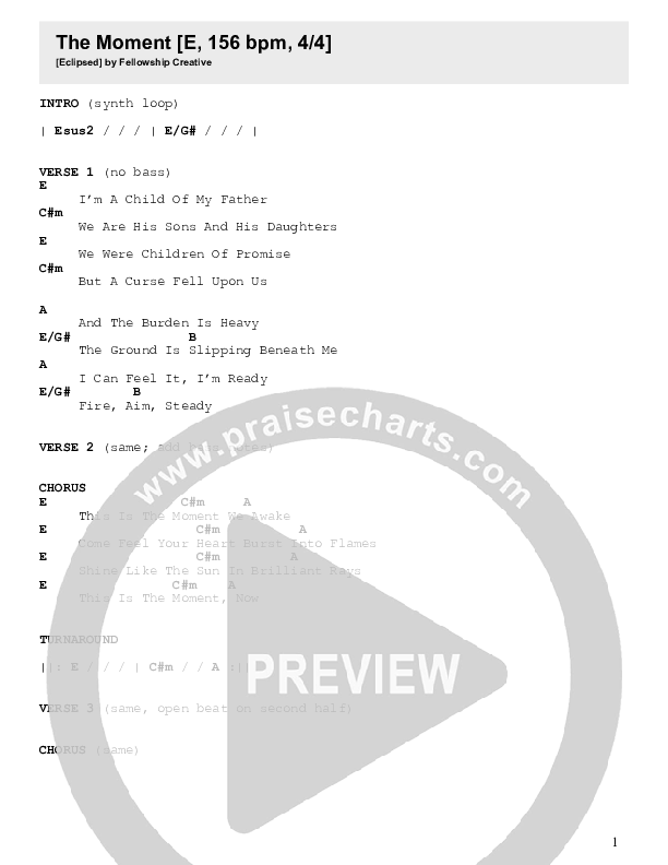 Download the PDF Chord Charts for The Moment by Fellowship Creative, from the album Eclipsed. This song was arranged by Fair Trade Music Publishing in the key of E.