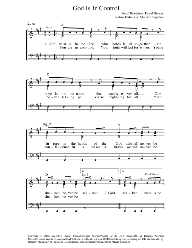 Download the sheet music for God Is In Control by Covenant Worship, from the album Take Heart. This song was arranged by Integrity Music in the key of A.