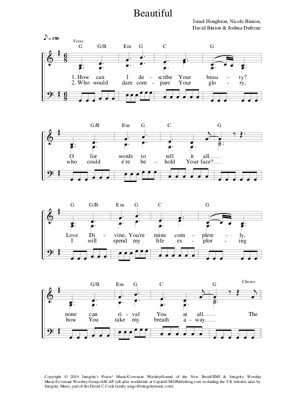 Download the sheet music for Beautiful by Covenant Worship, from the album Take Heart. This song was arranged by Integrity Music in the key of G.