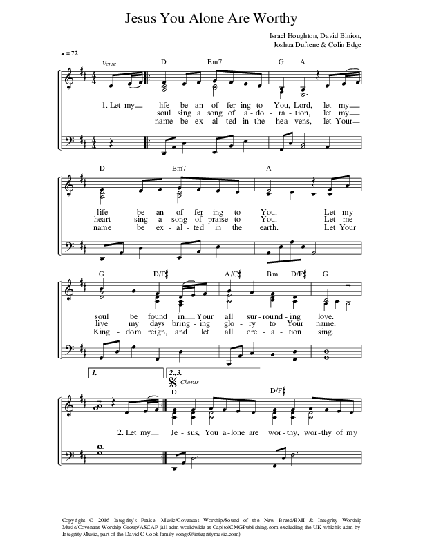 Download the sheet music for Jesus You Alone Are Worthy by Covenant Worship, from the album Take Heart. This song was arranged by Integrity Music in the key of D.