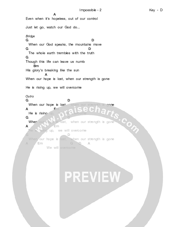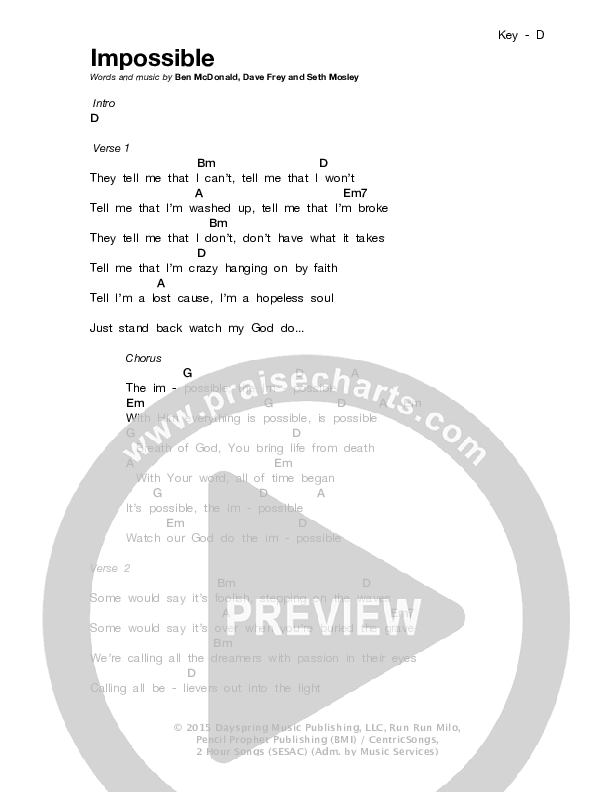 Download the PDF Chord Charts for Impossible by Sidewalk Prophets, from the album Something Different. This song was arranged by Word Music in the key of D.