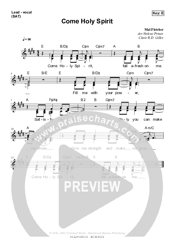 Download the sheet music for Come Holy Spirit by Dennis Prince / Nolene Prince, from the album Resource Christian Music.