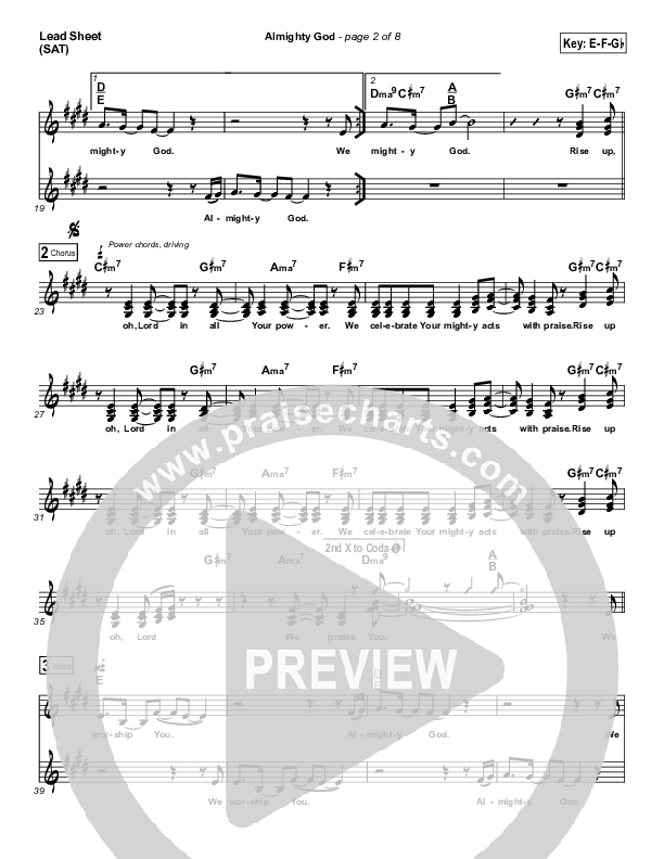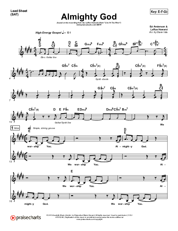Download the sheet music for Almighty God by LaRue Howard, from the album Live At The River. This song was arranged by Dave Iula in the key of E, Eb.
