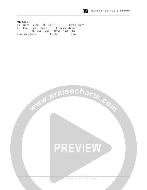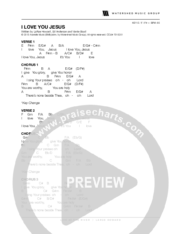 Download the PDF Chord Charts for I Love You Jesus by LaRue Howard, from the album Live At The River. This song was arranged by Watershed Music Group in the key of E.