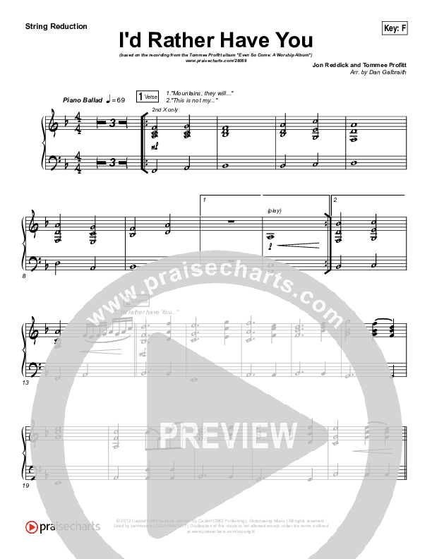 Download the Orchestration for I'd Rather Have You by Tommee Profitt & Brooke Griffith, from the album Even So Come: A Worship Album. This song was arranged by Daniel Galbraith in the key of F, G.