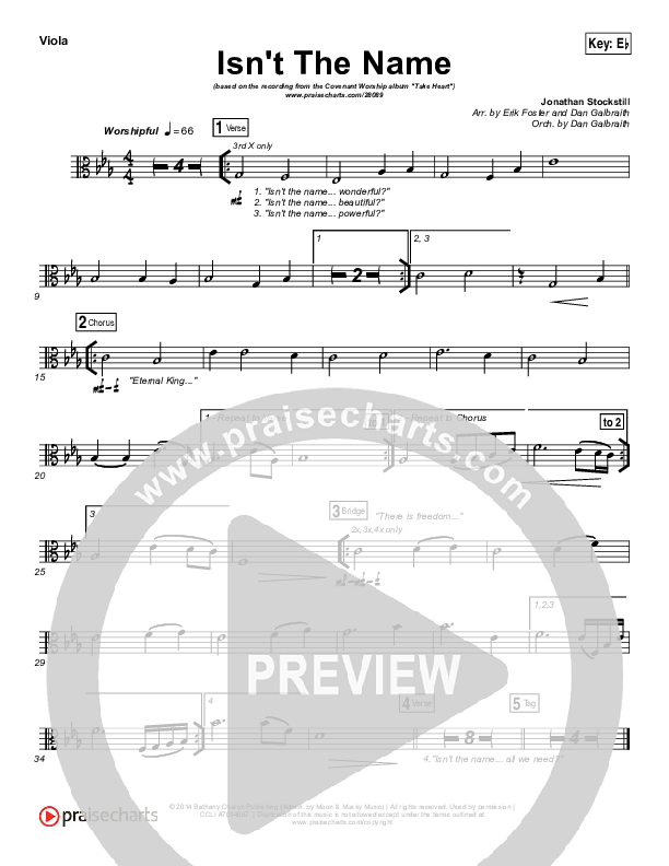 Download the Viola sheet music for Isn't The Name by Covenant Worship, from the album Take Heart. This song was arranged by Erik Foster / Daniel Galbraith in the key of D, E, Eb.