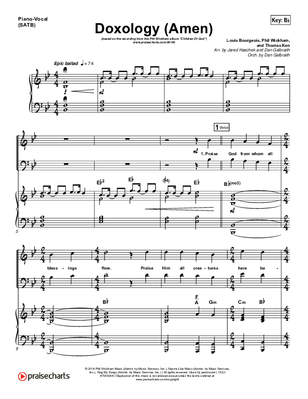 Download the sheet music for Doxology (Amen) by Phil Wickham, from the album Children Of God. This song was arranged by Jared Haschek / Daniel Galbraith in the key of A, Ab, Bb, F, G.