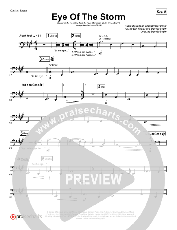 Download the Orchestration for Eye Of The Storm by Ryan Stevenson, from the album Fresh Start. This song was arranged by Erik Foster / Daniel Galbraith in the key of A, Bb, G.