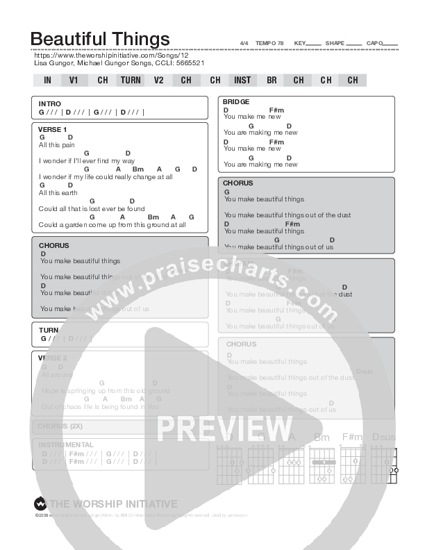 Download the PDF Chord Charts for Beautiful Things by Shane & Shane / The Worship Initiative, from the album The Worship Initiative Volume 1. This song was arranged by WI Charts in the key of D, Numbers.