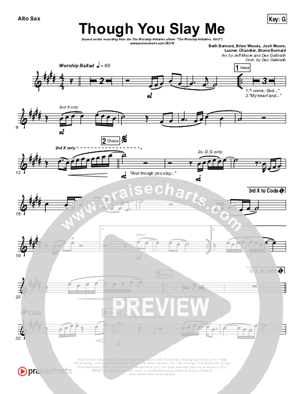 Download the AltoSax sheet music for Though You Slay Me by Shane & Shane / The Worship Initiative, from the album The Worship Initiative Volume 5. This song was arranged by Jeff Moore / Daniel Galbraith in the key of F, G.