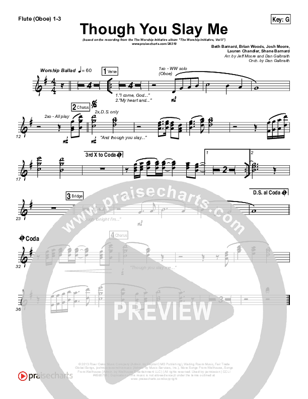 Download the Flute/Oboe sheet music for Though You Slay Me by Shane & Shane / The Worship Initiative, from the album The Worship Initiative Volume 5. This song was arranged by Jeff Moore / Daniel Galbraith in the key of F, G.